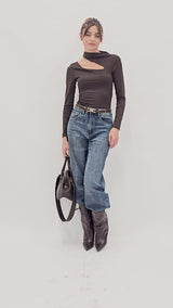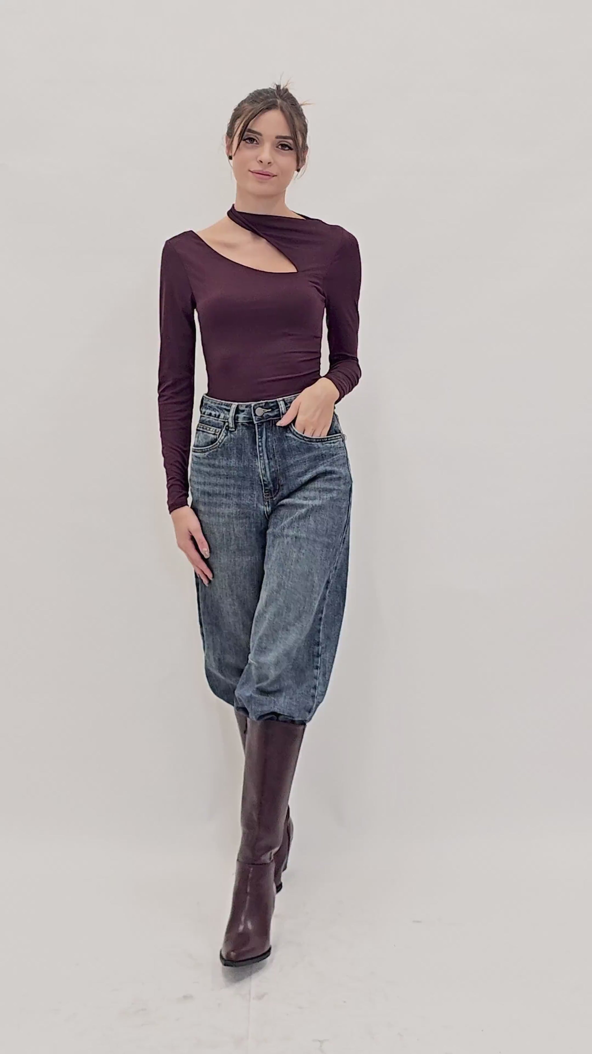 Realizzato in maglina elasticizzata, aderisce alla silhouette con una vestibilità confortevole e modellante. Il dettaglio del doppio scollo asimmetrico crea un gioco di linee unico: da un lato il collo alto effetto girocollo, dall’altro la spalla scoperta che dona sensualità ed eleganza.