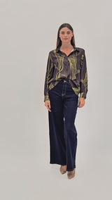 Linee sinuose e design contemporaneo: la Camicia Green Waves è realizzata in leggera tela rasata con fantasia geometrica che richiama onde fluide e dinamiche. Il modello semplice con bottoncini a colore la rende versatile e raffinata, perfetta da indossare aperta su un top per un look casual-chic o chiusa con pantaloni sartoriali per un outfit elegante e moderno.