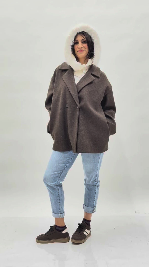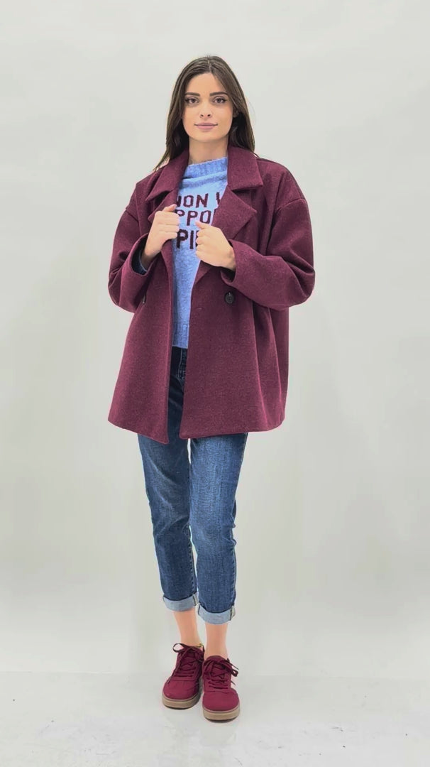 Cappotto corto dal taglio over in tessuto panno morbido, con ampio revers e chiusura doppiopetto.