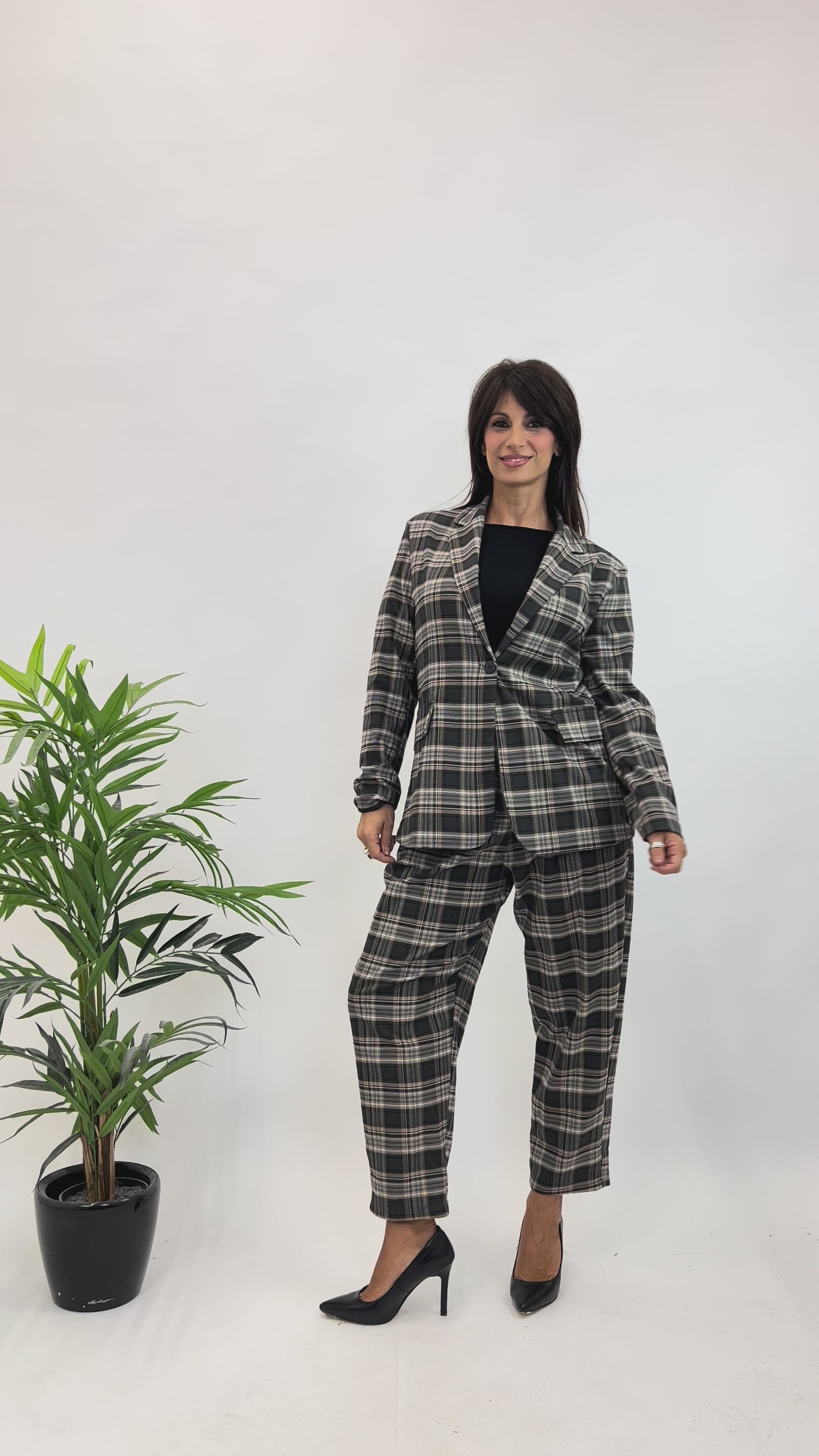 Un completo versatile e moderno: giacca over e pantalone balloon nello stesso tessuto a fantasia CheckMe grigia, perfetti per un look raffinato e senza tempo.