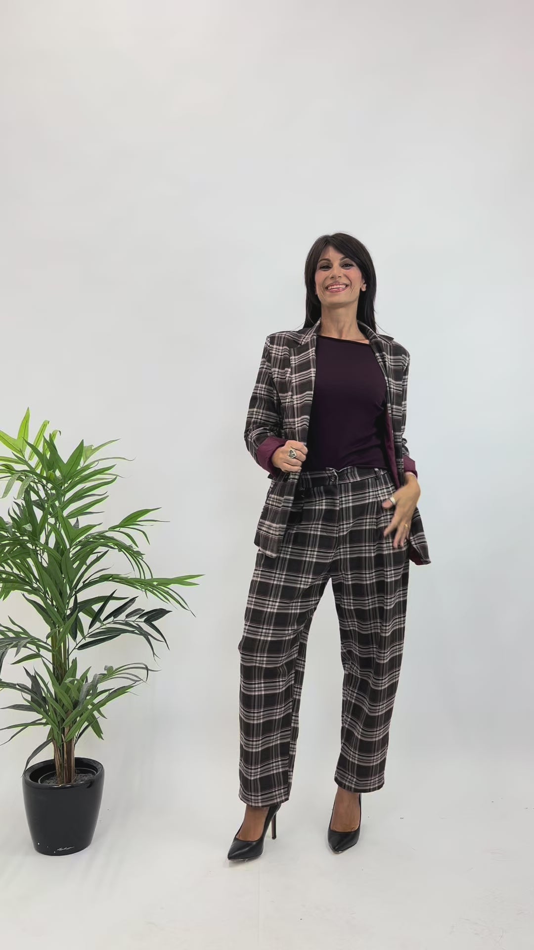 Un coordinato dal carattere deciso: giacca over e pantalone balloon nello stesso tessuto a fantasia CheckMe marrone, pensati per un total look contemporaneo e sofisticato.