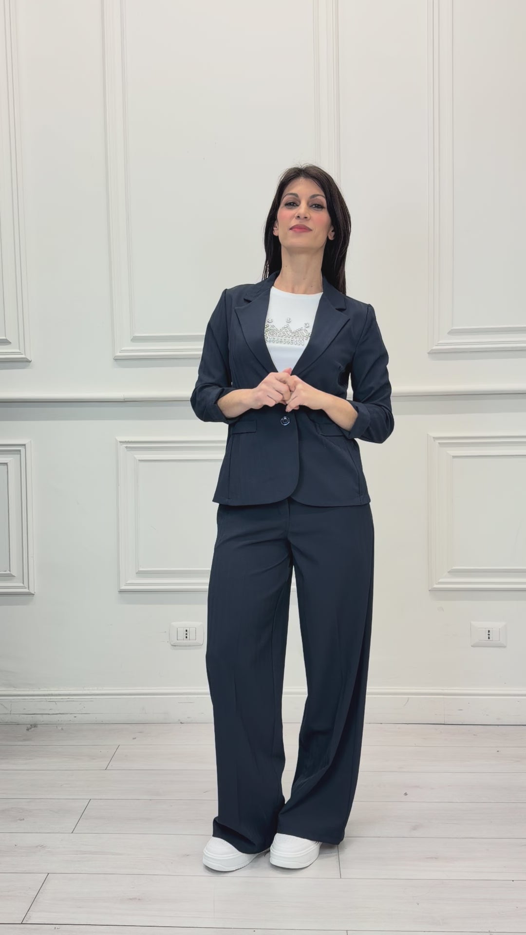Un elegante completo firmato con taglio avvitato e tessuto rigato spinato che dona profondità e raffinatezza al capo. La giacca presenta rever classico, chiusura a due bottoni tono su tono e tasche applicate, mentre il pantalone con gamba dritta offre un elastico nella parte posteriore della vita e passanti larghi per cintura. Entrambi i capi sono realizzati in tessuto strutturato ma confortevole, perfetti per look formali o casual. Made in Italy con composizione di 95% poliestere e 5%...