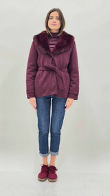 Giacca ecocamoscio corta con collo in eco-pelliccia - Bordeaux