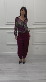 Ha due tasconi laterali e rimane largo sulla gamba stretto al fondo da un polsino chiuso da 3 bottoni con asola.